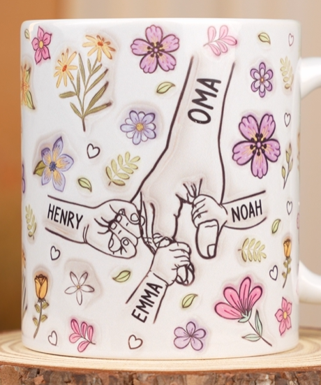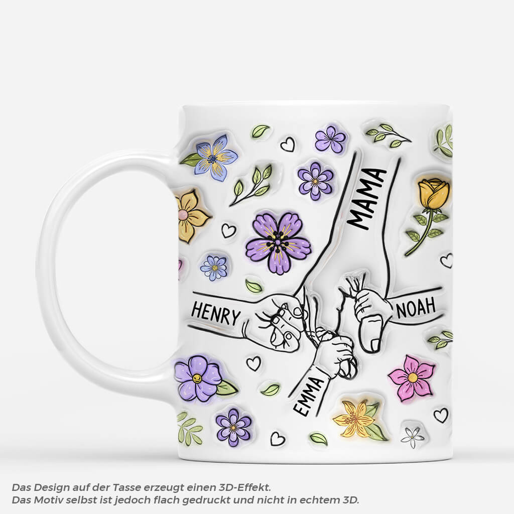 [3D-Druck-Effekt] Mama & Kinder Hand In Hand Blumen - Personalisiertes Geschenk | Tasse Mama