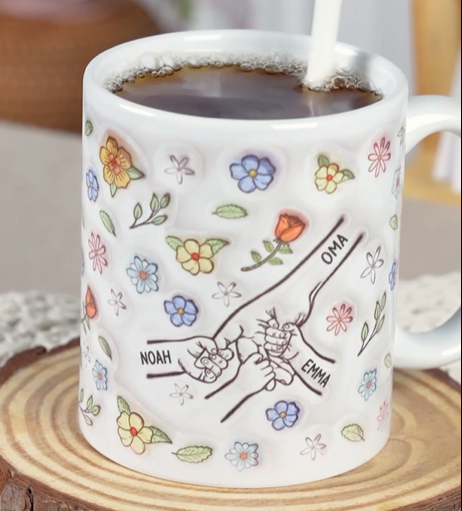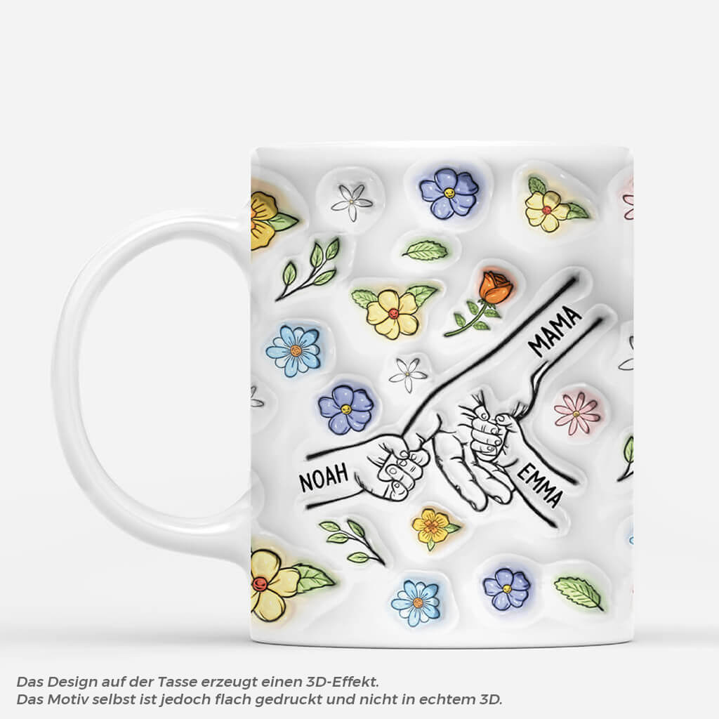 [3D-Druck-Effekt] Oma/Mama & Kinder Hand In Hand Blumen - Personalisiertes Geschenk | Tasse für Omas/Mamas