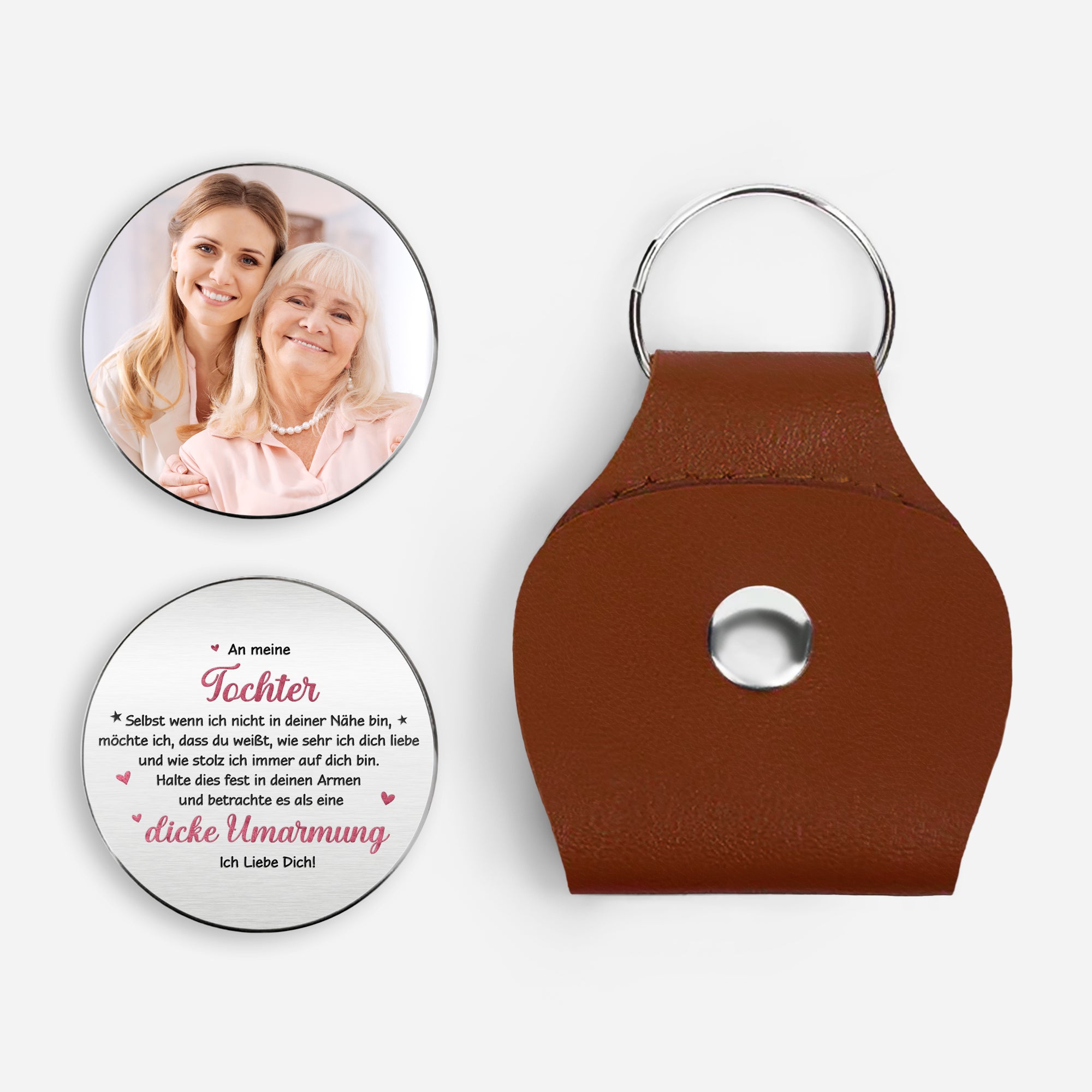 - Personalisierter Leder-Pocket Hug: Dieser charmante Begleiter besteht aus einem edlen PU-Leder-Etui im praktischen Schlüsselanhänger-Design. Im Inneren verbirgt sich ein runder Edelstahl-Token, der beidseitig mit Namen, Botschaften oder individuellen Designs bedruckt werden kann – ein persönliches Geschenk, das von Herzen kommt.