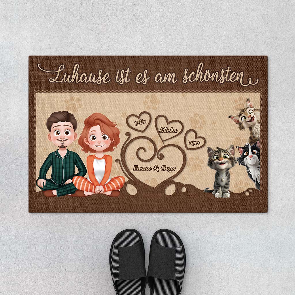 Home Sweet Home Cartoon - Personalisiertes Geschenk | Fußmatte Familie Mit Katze