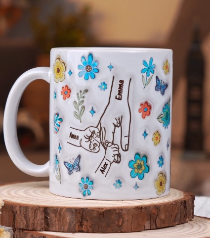 Mama Und Kinder Hand In Hand Blumen Und Tagfalter - Personalisiertes Geschenk | Tasse mit 3D Inflated Effekt für Mamas